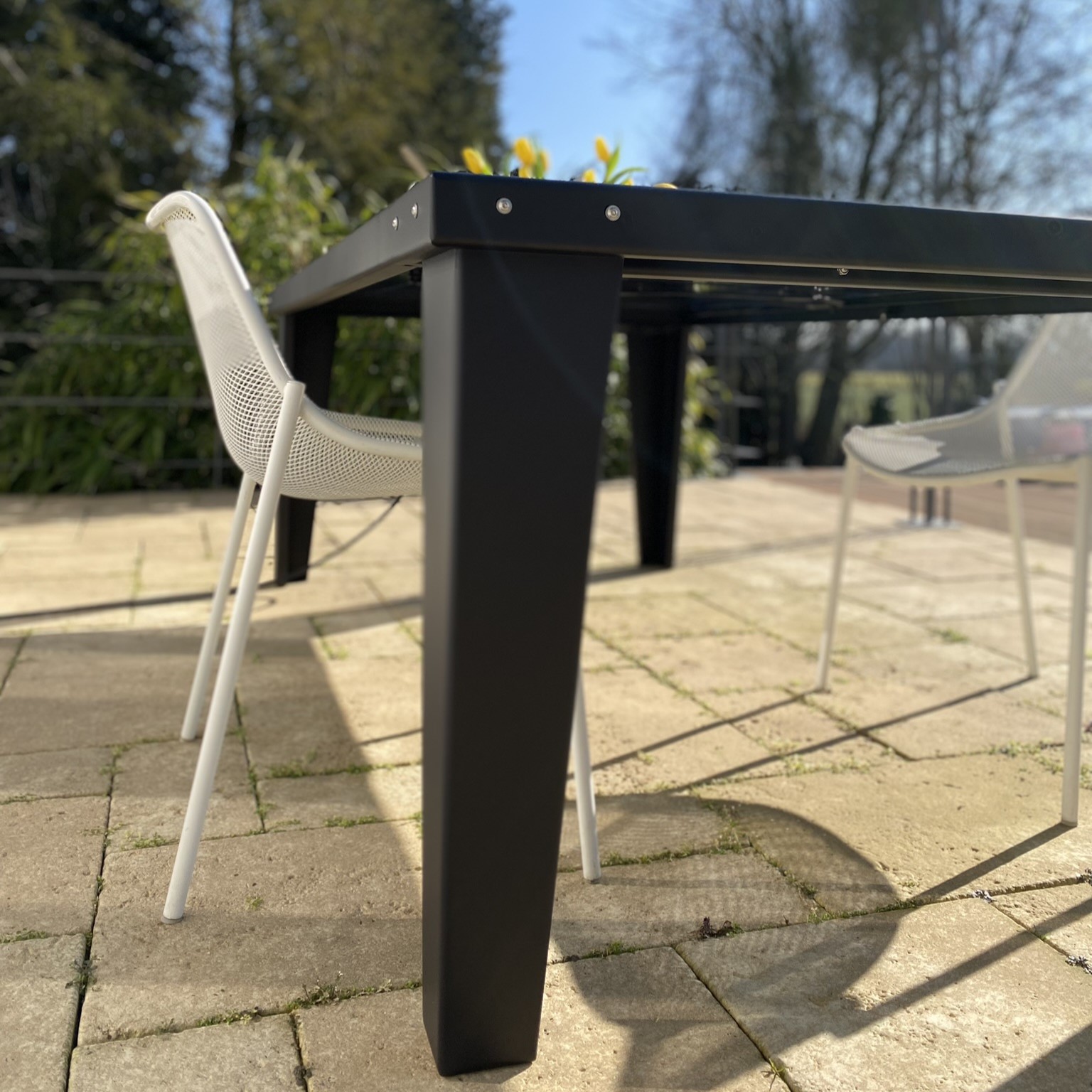 Hochwertige Materialien und Design: Das Tischgestell besteht aus pulverbeschichtetem Aluminium, das für seine Stabilität und Langlebigkeit bekannt ist.